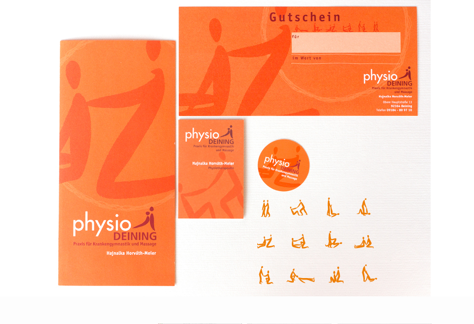 Unsere Leistungen: Komplette Geschäftsausstattung bestehend aus Signet, Briefpapier, Gutschein, Visitenkarten, 6seitiges Faltblatt, Aufkleber, Anzeigen, Kursplakat, Praxis-T-Shirt und 12 physio-Pictogramme.